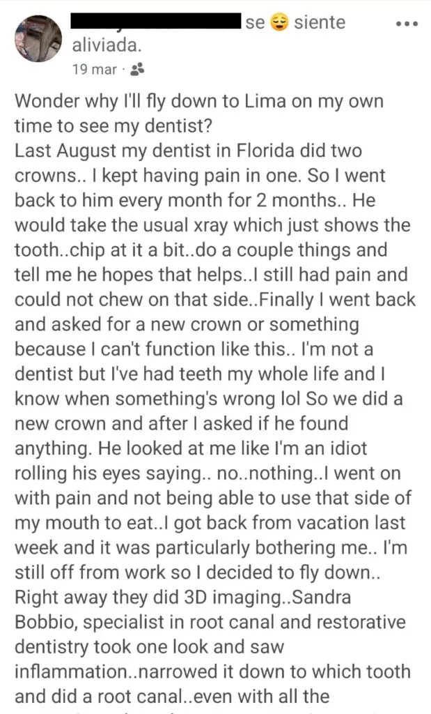Our patient Sandy commented on her overall experience between her local US dentist and us here in Lima
